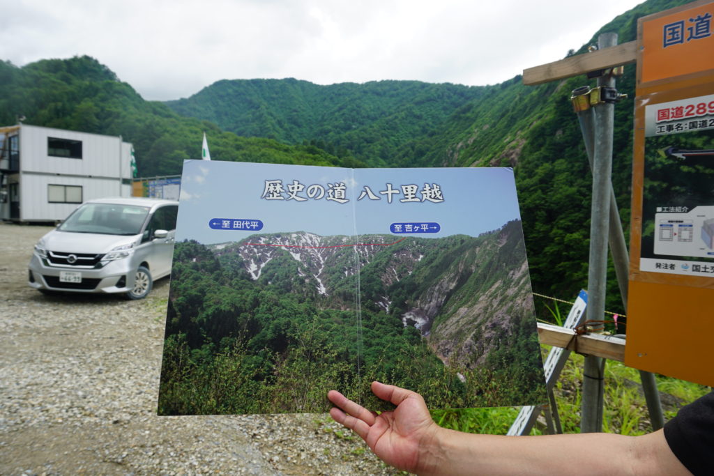 八丁沖の戦いで負傷した河井継之助は、慶応4年8月4日戸板に乗せられて八十里峠を越えた。パネルの赤い線が河井が越えた「河井新道」であり、実際の山と見比べても険峻なことがわかる。